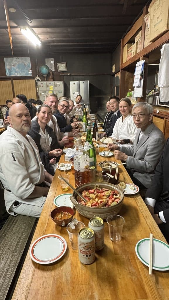 Och som om det inte kunde bli bättre, höll Doshu själv kvällspasset på lördagen! Doshu, som är sonson till O’Sensei, innehar den högsta titeln inom Aikido och leder Aikikai Foundation. Han för med sig år av erfarenhet och en djup förståelse för Aikidos principer och filosofi. Det blev dessutom en ära att få ha honom närvarande på vår Sayonara-party senare samma kväll. En vecka fylld av inspiration, lärande och värme!