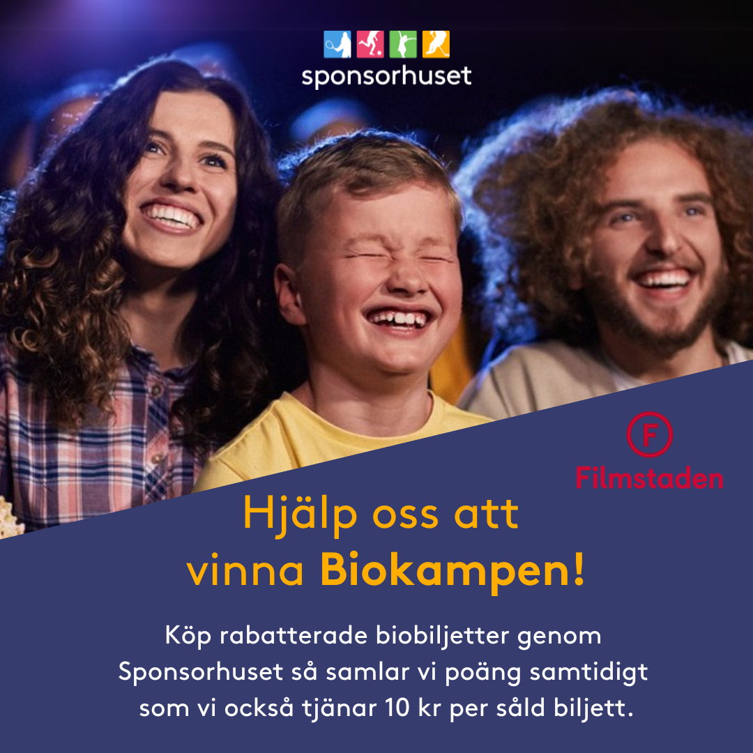 Sponsorhuset och Filmstaden kör en tävling där vi kan vinna en privat biovisning för 50 personer – inklusive snacks. Du stöttar oss genom att köpa rabatterade biobiljetter i vår Bioshop.